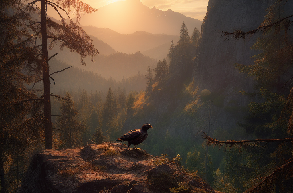 The sun was setting behind the craggy peaks, as an eagle’s cry pierced the veil of silence enveloping the ancient forest. There was an undeniable, primordial essence that seemed to ooze from the very roots of the towering pines, binding all who dared enter to the earth’s eternal dance. I stood at the mouth of a path where shadows leaped and flickered like ethereal guardians warning of trepidations beyond human cognizance.